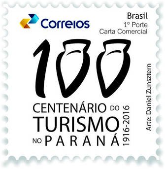 SELO PERSONALIZADO – O selo, com arte de Daniel Zunsztern, traz a logomarca do Centenário do Turismo do Paraná, na qual os zeros do numeral 100 são representados por pinhões, sementes da araucária, árvore-símbolo do estado do Paraná. O carimbo leva a inscrição “Rumo ao Centenário do Turismo no Paraná”.