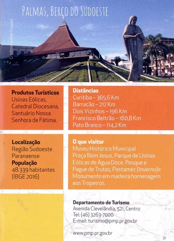 Os atrativos turísticos de Palmas, no Sudoeste do Paraná, integram a edição 2017 do “Passaporte Turístico – Vitrine da Regionalização”. A publicação, no formato livreto de bolso, é da Secretaria Estadual de Turismo e Paraná Turismo, com a intenção de estimular os paranaenses a conhecer, de forma prioritária, as atrações e locais de interesse turístico das quatro regiões do Estado.