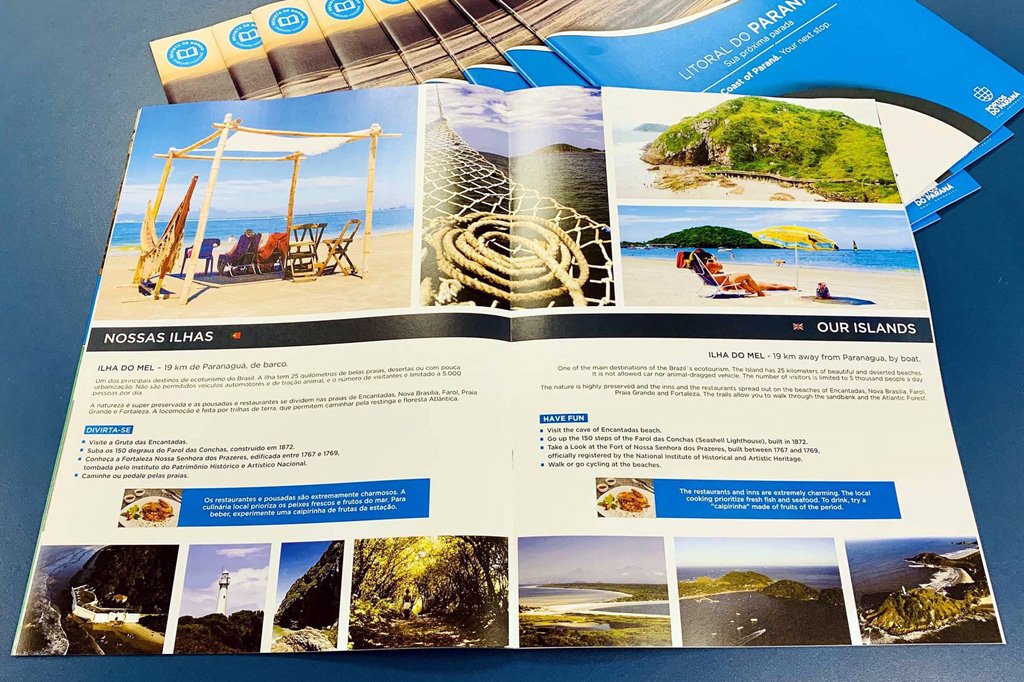 Em formato A3, bilíngue, com tiragem de 10.000 exemplares e recheada de belas imagens, a publicação dá opções de roteiros, indica a distância e modo de chegar a cidades, praias e ilhas de todo Litoral.